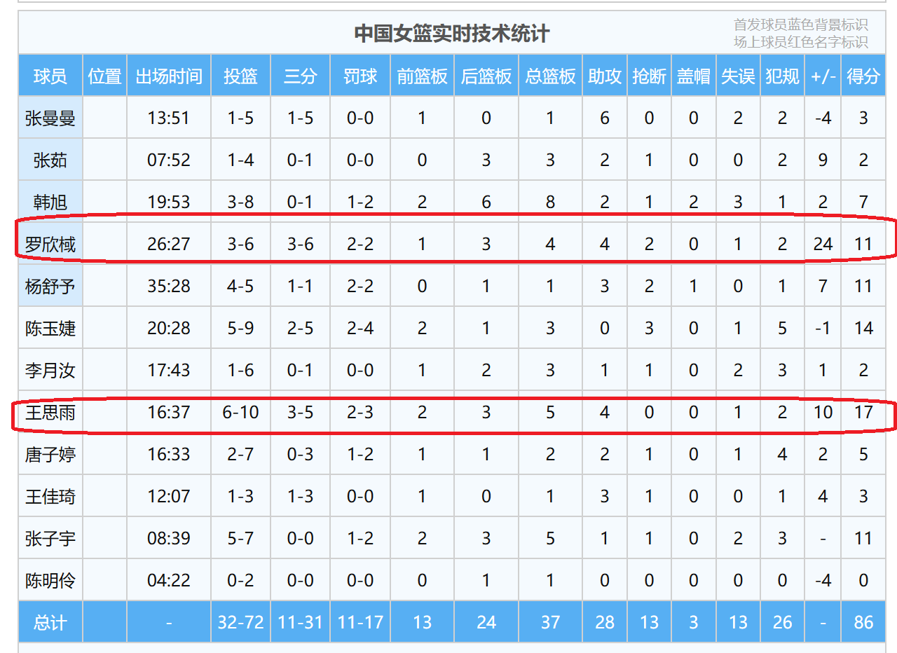 俗话说,数据不会说谎,从罗欣棫、王思雨的个人数据,正负值,就充分说明,她们的表现对球队的帮助巨大,是球队的赢球的最大功臣。